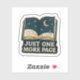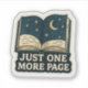 Embrace your late-night reading habits with this enchanting "Just One More Page" sticker! Featuring an open book revealing a celestial night sky with a crescent moon and sparkling stars, this durable vinyl decal perfectly captures the irresistible allure of getting lost in a good story. It's an ideal accessory for laptops, e-readers, water bottles, notebooks, or any surface where you want to show off your passion for reading and the magic of storytelling under the stars.