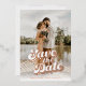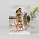 A wedding save the date with a custom photo and rose gold foil printed retro style typography is a unique and stylish way to announce your upcoming nuptials to your friends and family. The custom photo is a special touch that adds a personal and sentimental element to the design, while the rose gold foil printing adds a touch of glamour and sophistication. This design is sure to impress and get everyone excited for your big day.