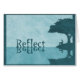 A green-blue textured drawing featuring the silhouette of a man sitting under a tree by a pond contemplating. The word "Reflect" rests on the lake's surface, the text and shadows reflected in the perfectly still water.