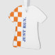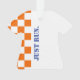 Chequerboard pattern in orange on white background with custom JUST RUN. in blue. Easy to personalise text, text colour. Great for ANY Runner, Race souvenir, daily inspiration, Running buddy gift. Modern, Colourful, Fun. Mix and match entire Running / Sports Collections by TMCdesigns.
