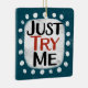 A fun typographic design that says "Just Try Me". It's black and red text on a white rectangle with funky, playful white dots surrounding it, all on a teal background.