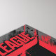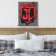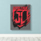 This Justice League JL shield movie logo is painted in bright red, accented with black and red brush strokes behind it.