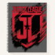 This Justice League JL shield movie logo is painted in bright red, accented with black and red brush strokes behind it.