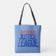 This patriotic Justice League graphic is tilted to the side and has the phrase "United We Stand" written on top of the Justice League logo.