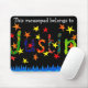 A good quality mousepad with a colourful handpainted paper collage design saying 'This mousepad belongs to Justin' on a black background. See also matching greeting card and gifts.
