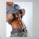 Colour photo of bodybuilder and fitness model Justin Woltering lifting his shirt to show his abs.