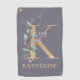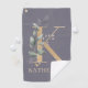 Letter K monogram floral. Letter K in golden brown texture accented with green watercolor compound leaves and berries and gold dust. Personalised with name in matching font. Set on unsaturated cold blue.