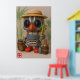 In its left hand, the character holds a bundle of green stalks, which appear to be sugarcane. At its feet are two small wooden barrels and two bottles, one of which is blue and has Japanese characters on it. The background is a light, neutral colour with a pattern of green leaves that resemble sugarcane.