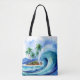 Crashing watercolor waves reveal a beautiful tropical island palm with palm trees. There are several versions of this design.