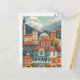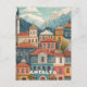 A beautifully detailed postcard capturing the charming old town of Kaleiçi in Antalya, Türkiye. the scene features colourful historic houses with traditional red-tiled roofs, ornate windows, and arched doorways, reflecting the architectural heritage of the region. nestled against a backdrop of majestic mountains and a bright blue sky, the town’s rich textures and warm tones create a welcoming atmosphere. a tall minaret and domed rooftops add to the authentic charm of this picturesque coastal destination, making this illustration a perfect blend of history, culture, and mediterranean beauty.