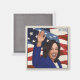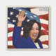 Portrait of the presidential candidate Kamala Harris with the stars and stripes and the wind behind her.