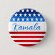 Kamala Harris Campaign SWAG US Flag Elegant Script button. For a Kamala Harris presidential campaign supporter design, a bold and empowering layout that combines typography and patriotic symbols to create a striking visual statement.  At the centre of the design, feature Kamala Harris's name in large, elegant typography. Use a modern font to convey a sense of forward-thinking and progress.  To enhance the design's visual appeal, add a subtle, polished finish with a  shadow effect, giving the typography a sense of depth and dimension. This approach not only highlights Kamala Harris’s name but also ensures the flag’s colours and patterns stand out vibrantly. This product aims to celebrate Kamala Harris’s candidacy with a strong, patriotic flair, using typography and the U.S. flag to create a powerful, supportive statement for her presidential campaign.