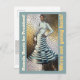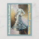 Kamala Harris for President! We're not going back!" postcard featuring a striking painting of a strong African American woman, confidently standing with a cat by her side. She wears a knee-length dress adorned with bold light blue and dark grey horizontal stripes that create an optical illusion, revealing a gold and white pattern. Her intricate dress accentuates her silhouette, embodying both elegance and power. The background showcases a complex, textured pattern that harmonises with the vibrant colours and forms, making this postcard a captivating statement of resilience and leadership.