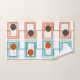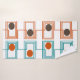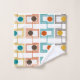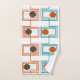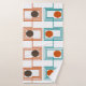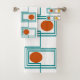 This towel set has a Kandinsky inspired mid-century modern design of sets of rectangles formed by a continuous line each with an oval inside in retro colours of orange, brown, gold, and turquoise on a white background. If you like the design but prefer different colours, message me.