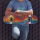 Kangaroo and Sunset - Aboriginal Style - Skateboard Deck Here is a description of a skateboard deck featuring Australian Aboriginal-style artwork, including details about Aboriginal art: The skateboard deck is a stunning canvas showcasing the vibrant and symbolic artistry of Australian Aboriginal culture. Aboriginal art is one of the oldest artistic traditions in the world, dating back over 60,000 years. It is deeply connected to the land, spirituality, and oral traditions of Aboriginal peoples. This deck's design is a breathtaking fusion of traditional Aboriginal motifs and contemporary skateboard artistry. Aboriginal iconography such as meandering line work representing paths and scattered dots suggesting stars or animal tracks. This masterpiece is not just a skateboard, but a celebration of the world's oldest living culture. Riding this deck is like gliding across a gateway into the rich storytelling traditions of Australia's First Peoples