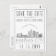 A unique wedding save-the-date postcard for a marriage taking place in the beautiful city of Kansas City, Missouri. This invitation features a stylised illustration of the city's unique skyline with its name underneath. This is followed by your wedding day information in a matching open lined style. On the reverse side of the post is your address information. All individual elements of the invite card are unlocked so feel free to change any details necessary such as font sizes, styles and more by using the customisation function. Have fun being creative and making it your own!