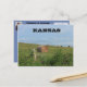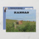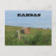 A shot of a Hay Bale, with blue sky, grass and a fence with weeds. Thats shot west of Lucas Kansas thats bright and colourful.Thats on a Post Card.