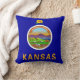 Crafted with high-quality materials and attention to detail, this pillow celebrates Kansas' heritage and state pride. The design prominently displays the iconic flag of Kansas, featuring a dark blue field with the state seal centred in gold and buff. The seal includes elements such as a landscape with a rising sun, a river, steamboat, and a Native American hunting bison, all surrounded by 34 stars representing Kansas as the 34th state to join the Union.