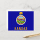 The official flag of Kansas consists of a dark blue rectangle arranged horizontally with the state seal aligned in the centre. The state name "KANSAS" is printed below the seal. Above the seal is a sunflower sitting over a gold and light blue bar. The state seal tells the history of Kansas and pioneer life. The thirty-four stars clustered at the top of the seal signify that Kansas was the 34th state to be accepted into the Union of the United States.