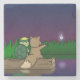 This coaster features a drawing of a kappa and a kitsune from behind, looking at a hitodama floating over a pond at dusk. This coaster is great for a fan of Japanese yokai, but the characters can also pass as just a turtle and fox, for those who aren't familiar with these mythological creatures.