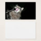 Grey tabby cat sings into a microphone amusing and comical karaoke photo business card