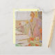Kirst Larsson looking thoughtfully at a yellow flower on a work table. Vintage watercolor by Swedish artist Carl Larsson.