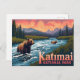 Dynamic vintage-style travel poster illustration depicting two large brown bears fishing in a rushing river, set against a backdrop of mountains and a colorful sunset sky, labeled "Katmai National Park." Captures the famous bear population and wilderness of the Alaskan park. Perfect for wildlife enthusiasts, Alaska travelers, and fans of bold, retro nature art.