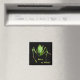 This magnet features a scary green katydid. Katydids are medium-sized to large insects. They are usually green, sometimes with brown markings, and are camouflaged to blend with the leaves they feed on. Their very long antennae distinguish them from grasshoppers. Seen up close, they seem to be aliens from outer space! The text reads: Not in my kitchen! It can be customised or removed.