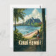 A serene and nostalgic depiction of Kauai, Hawaii, known as the "Garden Isle," showcasing its lush tropical landscapes and breathtaking coastal views. The design captures Kauai's dramatic cliffs, cascading waterfalls, and pristine beaches, all set against the backdrop of verdant rainforests and the sparkling Pacific Ocean. Rendered in a vintage style, the artwork evokes the island's natural beauty and tranquil atmosphere, inviting viewers to experience its idyllic charm and timeless allure.