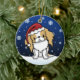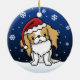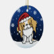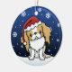 Cute red and white Japanese Chin Christmas Ornament, drawn in kawaii cartoon! This adorable dog breed is wearing a red Santa hat, and snowflakes are falling all around him. Absolutely darling, perfect for the dog lover's Xmas tree!