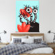 Cute monster canvas art with a black cartoon creature with four eyes on long black and white striped stems smiling, hidden in abstract red tulips.