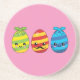 An illustration of three cute kawaii easter eggs with ribbons and stripe colors of yellow, red and blue. This design is a gift idea for easter egg hunter lovers, colorful things lovers and funny faces emoji lovers.