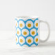 A repeat pattern of happy fried eggs sunny side up on a blue background.