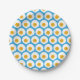 A repeat pattern of happy fried eggs sunny side up on a blue background.