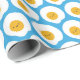 A repeat pattern of happy fried eggs sunny side up on a blue background.