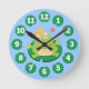 Kawaii cartoon of a frog with sparkling eyes and a crown on its head. The frog prince is sitting on a lily pad in the pond looking upwards with a heart around its head. The clock face numbers are uniquely placed on lily pads to tie in with the whole theme. This adorable and colourful design makes it attractive for kids. Designed by Rusty Doodle.