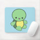 A mousepad featruring a cute smiling green baby kawaii turtle waving hi on a baby blue background!
