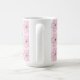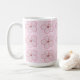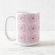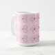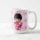 A cute mug featuring a kokeshi doll in a pink kimono with a cute yellow hat on a cherry blossom background. A fun combination of Japanese traditional art and flirty kawaii style.