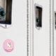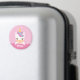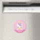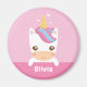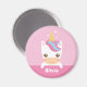 A magnet with a cute illustration of a little white unicorn with pink and blue mane with a pink stars and hearts pattern background. Personalise with the name of the little girl!