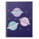 Cute planets with kawaii faces and tiny stars in space. Pastel colours on a dark blue background.