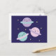 Cute planets with kawaii faces and tiny stars in space. Pastel colours on a dark blue background.