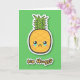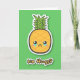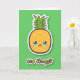Cartoon of a cute orange pineapple feeling sad and emote with tears falling down its cheeks. Caption reads "No Hugs?" Message inside reads "But it's your last day! I'm going to miss you!" Design is treated with a white border and shadow effect to give it a pop up effect. A kawaii farewell card.