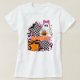 Trendy kawaii Halloween t-shirt featuring a cute ghost, pumpkin with bow, chequered stars & bold pink splashes 🎀🎃⭐. Perfect for spooky season lovers with Y2K vibes! Keywords: y2k halloween tee, cute ghost shirt, spooky girl aesthetic, pastel goth halloween.