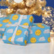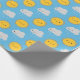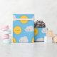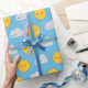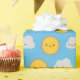 Repeat pattern of happy suns and sad rain clouds on a blue sky background for changeable springtime weather.