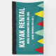 Advertise your kayak business or event. Edit all text to your information. Retro colour palette design with colourful kayak icons at the bottom on a river water background.