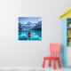 Poster with an illustration of a man kayaking in the ocean by the snow topped mountains. Pretty serene blue tranquil water and pine trees surround him on a peaceful journey.