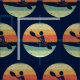 Beautiful kayak fabric on midnight blue featuring a kayaker rowing on a lake at sunset in a cool pattern. Cute kayaking fabric gift.