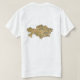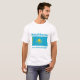 An editable title and slogan accompanies the yellow motifs on a blue background of the Kazakhstani flag on the front of this t-shirt. The back displays a detailed map of Kazakhstan.