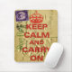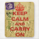 Popular British vintage keep calm and carry on motivational slogan saying on an antique retro postcard with old Queen Elizabeth the 2nd postage stamp. Copyright Oconnart