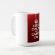A mug featuring Keep Calm and Carry On slogan in white coloured text and glowing red background